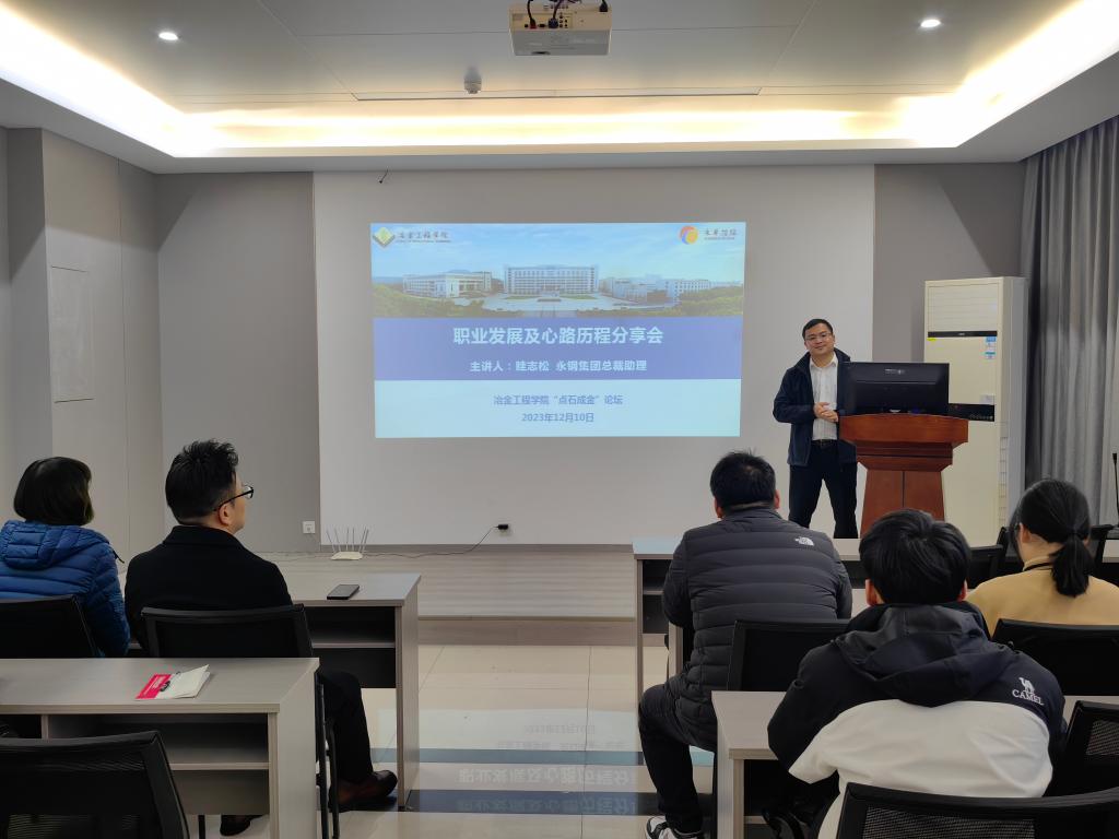 12月10日,2002届优秀员工、永钢集团总裁助理眭志松回母校作客beet365“点石成金”论坛,分享职业发展及心路历程,公司师生代表100余人参加了此次论坛。