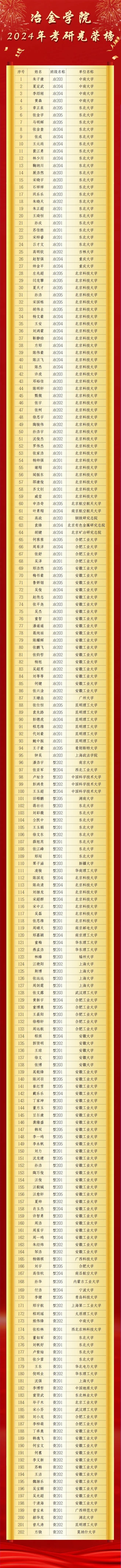 在2024年考研中,beet3652024届本科毕业生共有202位升学深造(其中国内升学200名,境外升学2名)!占毕业人数的48.44%,其中被双一流、985、211院校录取的占总录取人数的63%。录取院校包括南京大学、西北工业大学、中国科学技术大学、中南大学、西北农林科技大学、湖南大学、重庆大学、东北大学、吉林大学、北京科技大学、华南理工大学、南京邮电大学、南京航空航天大学、南京理工大学、北京航天航空大学、华北电力大学、北京钢铁研究总院、北京有色金属研究总院、北京矿冶研究总院、华东理工大学、福州大学、上海大学、中国地质大学、东北林业大学、北京工业大学、武汉理工大学、合肥工业大学、安徽大学、新疆大学等知名高校。