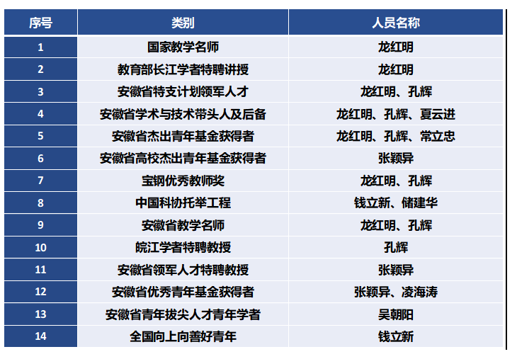 冶金工程系现有教师40人,具有博士学位37人,教授15人。其中国家级教学名师1人,教育部长江学者特聘讲授1人,省学术与技术带头人2名及后备人选1人,获皖江学者、安徽省“特支计划”人才3人,安徽省领军人才特聘教授1人,安徽省青年拔尖人才青年学者1人,中国科协青年托举工程人才2人,安徽省战略新兴产业技术领军人才2人 ,4人获得“中国金属学会冶金青年科技奖”“冶金先进青年科技工作者”和“全国高校冶金经理奖”,1人获“钢铁工业优秀科技工作者”。安徽省教学名师、教坛新秀各2人, 2人获得宝钢优秀教师奖,3人获得安徽省杰青项目资助,1人获安徽省高校杰青项目资助,2人获省优青人才项目资助。目前,全系保持着团结协作、氛围宽松、团队结构合理的学术环境,拥有省级教研创新团队4个,校级科技创新团队和校级教学团队各2个。