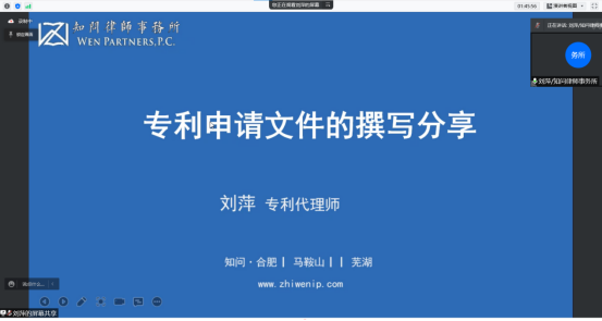 4月5日,beet365第17期创新创业训练营邀请安徽知问律师事务所专利代理师刘萍,给同学们线上进行题为《专利申请文件的撰写分享》的培训,培训由训练营班主任吴巍主持。