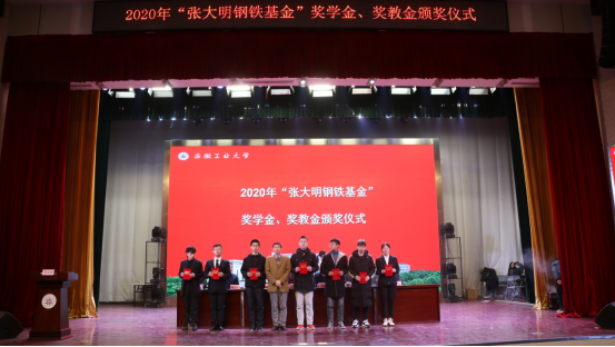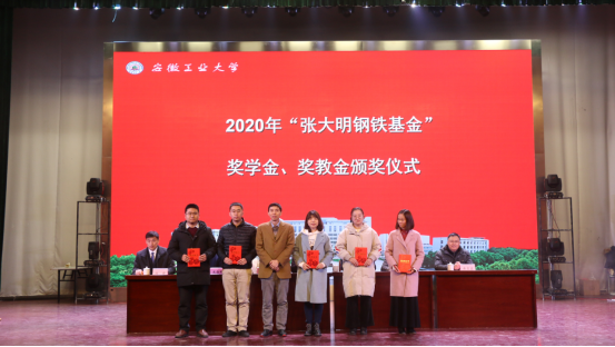 张大明为颁奖仪式致辞,宣读2020年“张大明钢铁基金”奖学金奖教金获奖名单,并为吴禧龙等7位员工颁发奖学金,为徐亮、李娜、田勇攀、陶素芬、吴婷5位教师颁发奖教金。吴禧龙作为受表彰的员工代表发言,张大明与受表彰的教师和员工合影留念。