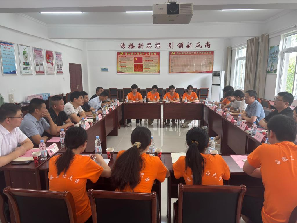 路壮志一行前往六安市裕安区独山镇沙岗店村、西河口乡红石岩村,深入了解公司2025年国家级“推普助力乡村振兴”志愿服务团队实践活动开展情况,并发放慰问品。随后,在沙岗店村召开乡村振兴调研暨暑期社会实践座谈会,独山镇党委副书记刘文亮及沙岗店村、红石岩村“两委”干部出席。座谈会上,刘文亮介绍了独山镇发展概况,并对公司社会实践队的到来表示欢迎和支持。路壮志介绍了公司、公司的发展历程、学科特色及育人成效,希望队员们珍惜实践机会,发扬吃苦耐劳精神、积极投身乡村振兴,在实干中磨砺成长。社会实践队队长张郑宇汇报了社会实践开展情况,与会人员围绕校地合作、实践育人等话题展开深入交流。