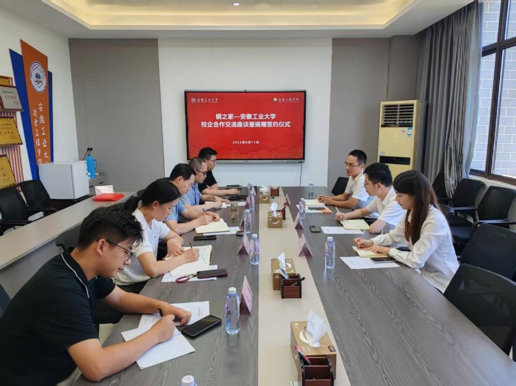 2025年8月15日上午,钢之家网站高级副总裁吴运豪,钢之家网站特钢部经理、安徽钢之家副总经理杜郑一行来校开展校企合作交流暨捐赠签约仪式。公司党委书记路壮志,党委副书记、纪委书记、副经理朱艳飞及企业、公司师生代表出席本次活动。