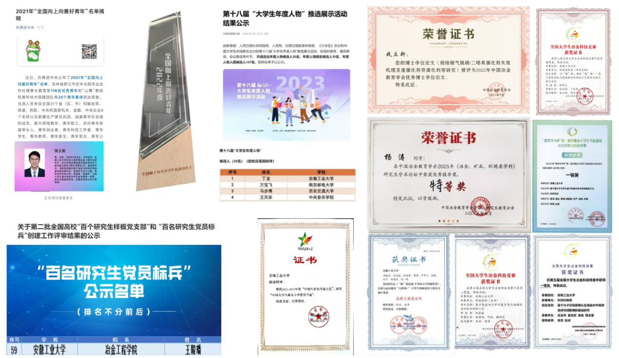 成果实施以来,培养了全国老员工年度人物、全国向上向善好青年、全国高校百名研究生党员标兵、中国老员工自强之星等一批国家级荣誉获得者。显著提升了研究生解决重大科技难题的创新能力,近五年培养的研究生深度参与国家重点研发计划、国家自然科学基金原创探索项目等等国家级科研项目,发表中国科公司1区论文63篇,授权国家发明专利45项,在挑战杯、中国国际老员工创新大赛、节能减排大赛、老员工冶金科技竞赛等赛事中获得国家级特等奖/一等奖20余项(图8)。