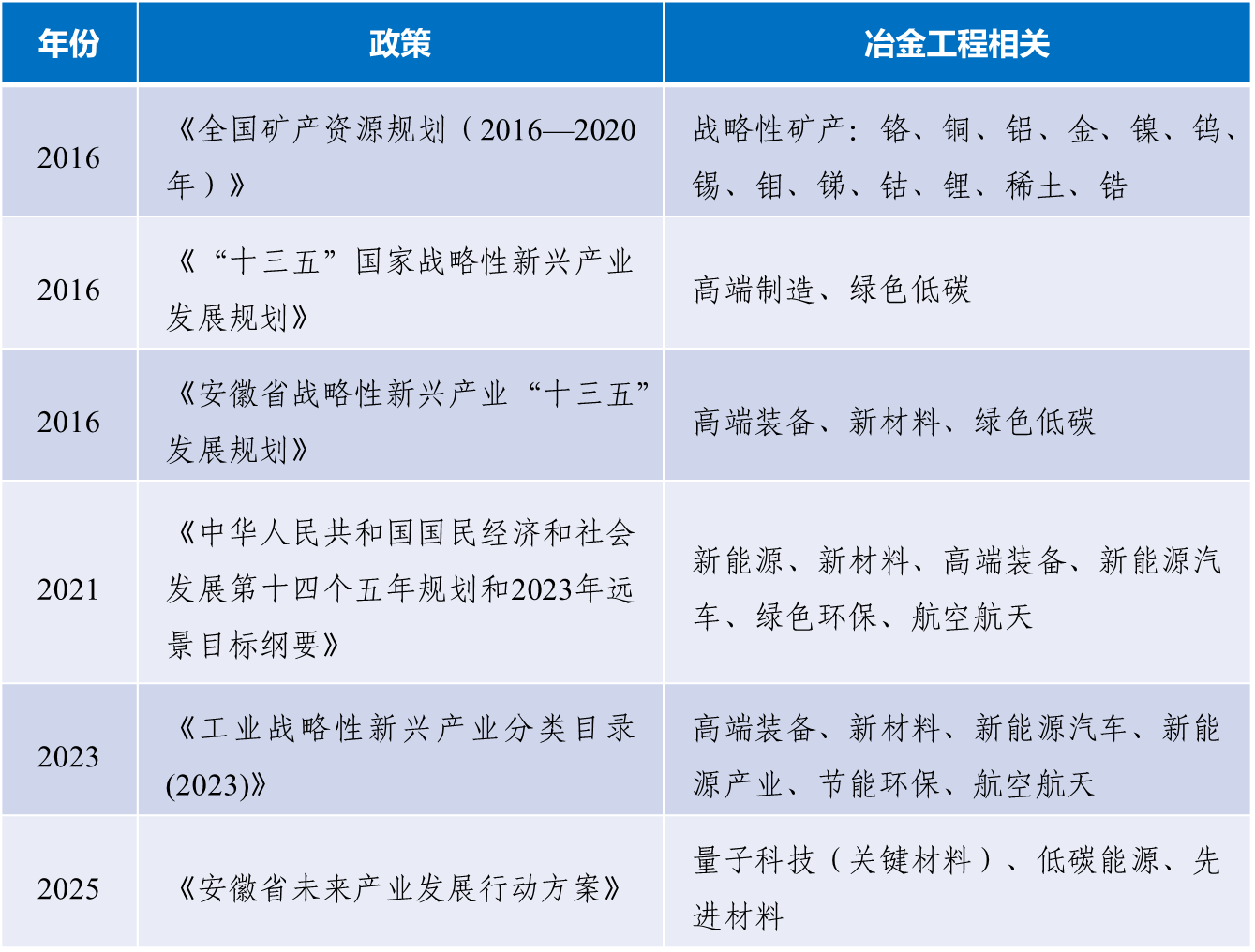 战略金属是保障国家安全与科技发展的重要基石,铜、锂、稀土、钴、镍、钨等被列入国家战略性矿产目录。战略新兴产业是对经济社会全局和长远发展具有重大引领带动作用的产业,新能源汽车、新一代信息技术、航空航天等产业被列入《中国制造2025》核心领域,其发展高度依赖战略金属供给(图1)。为维护国家安全与利益,避免关键矿产和高端技术“卡脖子”,保障产业链、供应链安全稳定,国家高度重视战略金属与战略新兴产业,将其视为维护国家安全、推动经济转型升级和抢占未来竞争制高点的核心支撑。近年来,在战略金属及其相关新兴产业领域出台了一系列政策(表1),以保障我国的资源安全以及在未来科技竞争中的领先地位。