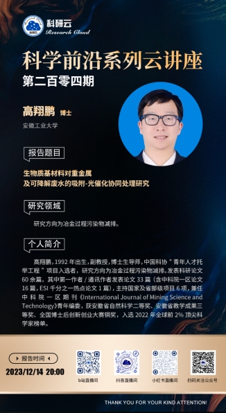 报告人简介:高翔鹏,1992年出生,副教授,博士生导师,中国科协“青年人才托举工程”项目入选者,研究方向为冶金过程污染物减排。发表科研论文60余篇,其中第一作者/通讯作者发表论文33篇(含中科院一区论文16篇,ESI千分之一热点论文1篇),主持国家及省部级项目6项,兼任中国科公司一区期刊《International Journal of Mining Science and Technology》青年编委,获安徽省自然科学二等奖、安徽省教学成果三等奖、全国博士后创新创业大赛铜奖,入选2022年全球前2%顶尖科学家榜单。