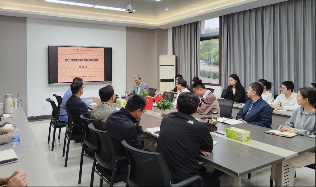 邢献然教授做了题为《稀土金属材料磁结构与新物性》的学术报告,详细介绍了稀土金属间化合物和稀土合金的固体负热膨胀和性能调控、材料磁结构、稀土双相合金及其晶格应变等方面的研究成果与前沿进展。报告内容丰富、理论性强,极大地拓宽了师生们的视野、激发了浓厚的学术热情。