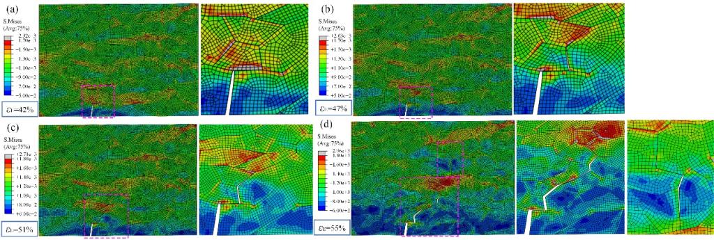 本项研究中,研究人员对经历高达55%工程应变后的TRIP型双相不锈钢进行了详细的微裂纹特性分析,并总结了各类界面处微裂纹分布的特点。为了定量描述相间或晶间多滑移变形的异质性,采用晶体塑性有限元法(CPFEM)来计算滑移系统的塑性速度梯度张量及滑移率,进而建立了变形协调参数和晶间滑移传递参数。基于Luster-Morris参数(m),并结合考虑了激活滑移系统中的多滑移行为与具体滑移率等因素,创新性地提出了一个新的滑移传递参数,用以表征界面处的滑移传递特性。随后,基于此新定义的滑移传递参数构建了一个界面损伤模型,揭示了变形异质性与损伤之间的关联机理,并为微裂纹萌生与扩展提供了依据。此项研究成果不仅丰富了多相亚稳态材料损伤理论体系,也为这类高性能低成本新材料的应用开发奠定了坚实的技术基础。