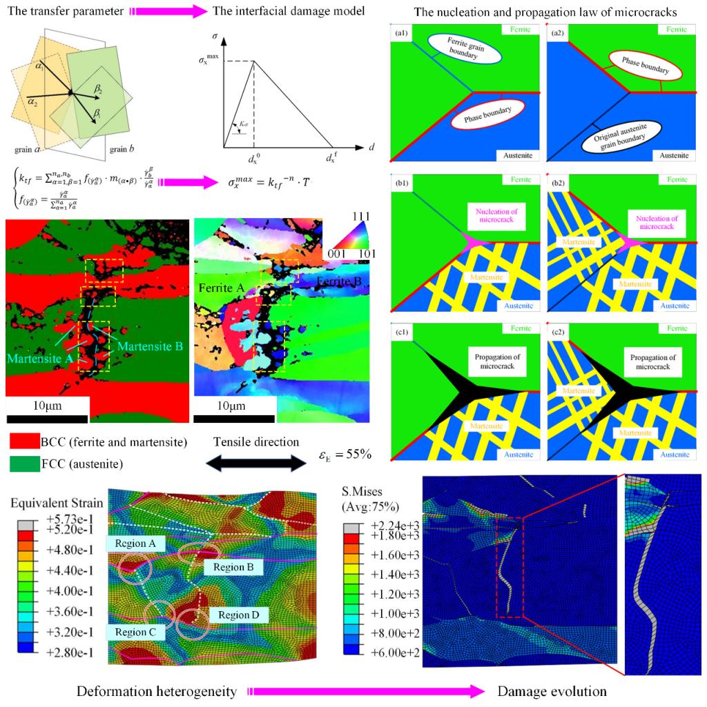 研究聚焦于Mn-N合金化双相不锈钢,通过降低镍含量并有效利用相变诱导塑性(TRIP),显著提升了材料在变形过程中的塑性和强度。这种新型的TRIP型双相不锈钢(TDSS)有望克服传统双相不锈钢成型时面临的塑性不足、硬化能力低等问题,成为一种极具发展潜力且成本效益高的高性能结构材料。然而,由于钢中存在三相(即残余奥氏体、铁素体以及马氏体)混合形成的复杂微观结构,导致不均匀性的变形行为及其相关损伤机制变得尤为复杂。因此,深入理解不同类型界面(包括铁素体/奥氏体、铁素体/马氏体、奥氏体/马氏体的相界及各相内部的晶界)上的损伤演化规律对于预测其他多相或两相材料的成形性能具有重要意义。