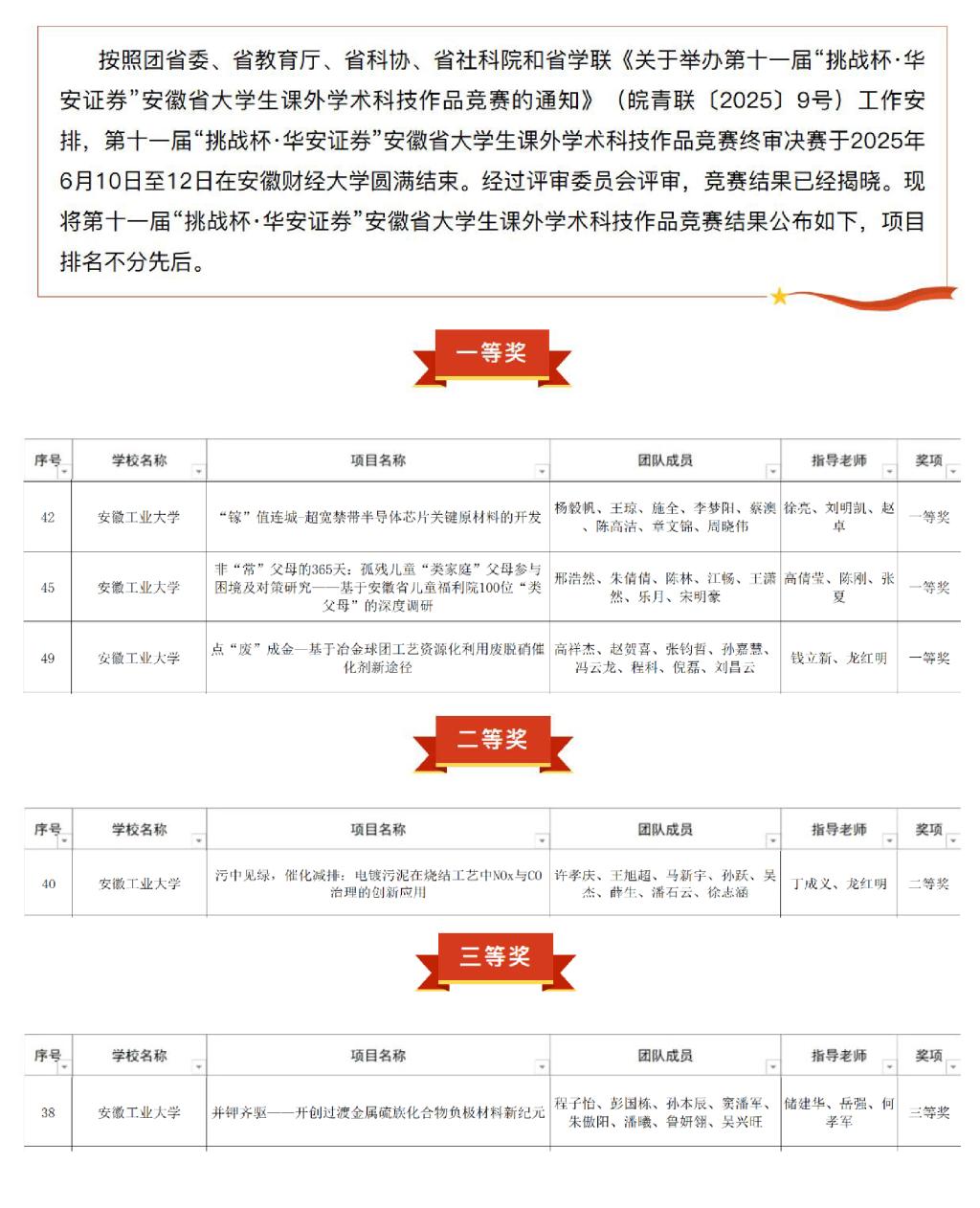 比赛以“科创江淮智赢未来”为主题,自赛事开始以来共收集全省108所公司推荐的1165件项目,经过组委会初审,86所高校350个项目入围省级决赛。公司共有四个项目入围决赛,经过决赛激烈角逐,《点“废”成金基于冶金球团工艺资源化利用废脱硝催化剂新途径》《“镓”值连城-超宽禁带半导体芯片关键原材料的开发》和《非“常”父母的365天:孤残儿童“类家庭”父母参与困境及对策研究——基于安徽省儿童福利院100位“类父母”的深度调研》等三个项目斩获省赛一等奖,《污中见绿,催化减排:电镀污泥在烧结工艺中NOx与CO治理的创新应用》获省赛二等奖,创公司在“挑战杯”省赛中最好成绩。